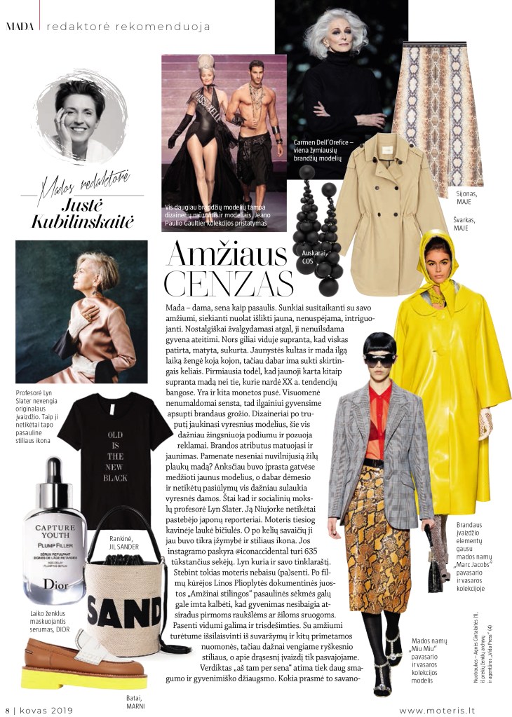 Vasara jau beveik baigėsi ir darosi šiek tiek liūdna. Netrukus darganotas ruduo ir ilga kaip šimtmečiai žiema. Bet ir ji, kaip ką tik prabėgusi saulėta vasara, praeis ir vėl kartosis. Vienintelis amžinas dalykas – nuolatinė kaita. Mada, kaip niekas kitas, tai puikiai iliustruoja. Keista, kad suvokdami jos permainingą prigimtį, vis dar sekame kiekvieną pokytį ir stengiamės neatsilikti. Kartais atrodo, jog geriau būtų atsisėsti, kaip prie tekančios upės, ir stebėti pro šalį praplaukiančias sroves. Pro akis nuvilnys ne kartą matyti siluetai, o iš pažiūros nauji bus nunešti tendencijų tėkmės vos spėjus juos pasimatuoti. Kaita ir permaininga įvairovė suteikia įspūdžių ir impulsų. Tačiau šiandien esame įstrigę klastingose pinklėse. Natūralią kaitą užgožė dirbtinė, primesta vartojimo kultūros, technologijų, beprotiško gyvenimo tempo. Mus nuolat atakuoja atsinaujinimo programos ir „virusai“. Kas paseno – keičiama nauju. Jei neatnaujinsi įrangos ar modelio liksi už borto. Tačiau kasdien senstančio (o iš tiesų natūraliai kintančio) kūno taip lengvai neišmesi ir nepakeisi kitu. Kiekvienas randas ar raukšlelė liudija apie mums visiems įgimtą ir vienijantį bruožą – nuolatinę, visagalę kaitą. Puoselėti ar kovoti – du skirtingi keliai atvedantys prie skirtingų rezultatų ir emocinių būsenų. Įdomu stebėti jaunąją kartą, kuri pasidavė nostalgiškoms nuotaikoms ir žavisi tuo, kas buvo madoje prieš 20-30 metų. Jiems tai atrodo tikra, įdomu, autentiška. Daiktai turintys ir pasakojantys istorijas, kurių taip stinga šiandieniniame ekranų plokštumoje mirguliuojančiame gyvenime. Iš praeities prikeltas daiktas, tarsi rankinis stabdis, priverčia bent trumpam pajusti istorijos ir dabarties ryšį. Ir nors laikai nenumaldomai kaičiasi gera matyti šiuolaikinius paauglius, kurie, visai kaip mes savu laiku, klausosi vinilinių plokštelių, per naktis žiūri senus filmus, o atsakymus į svarbiausius klausimus randa ne Google, o pageltusiuose knygų puslapiuose…